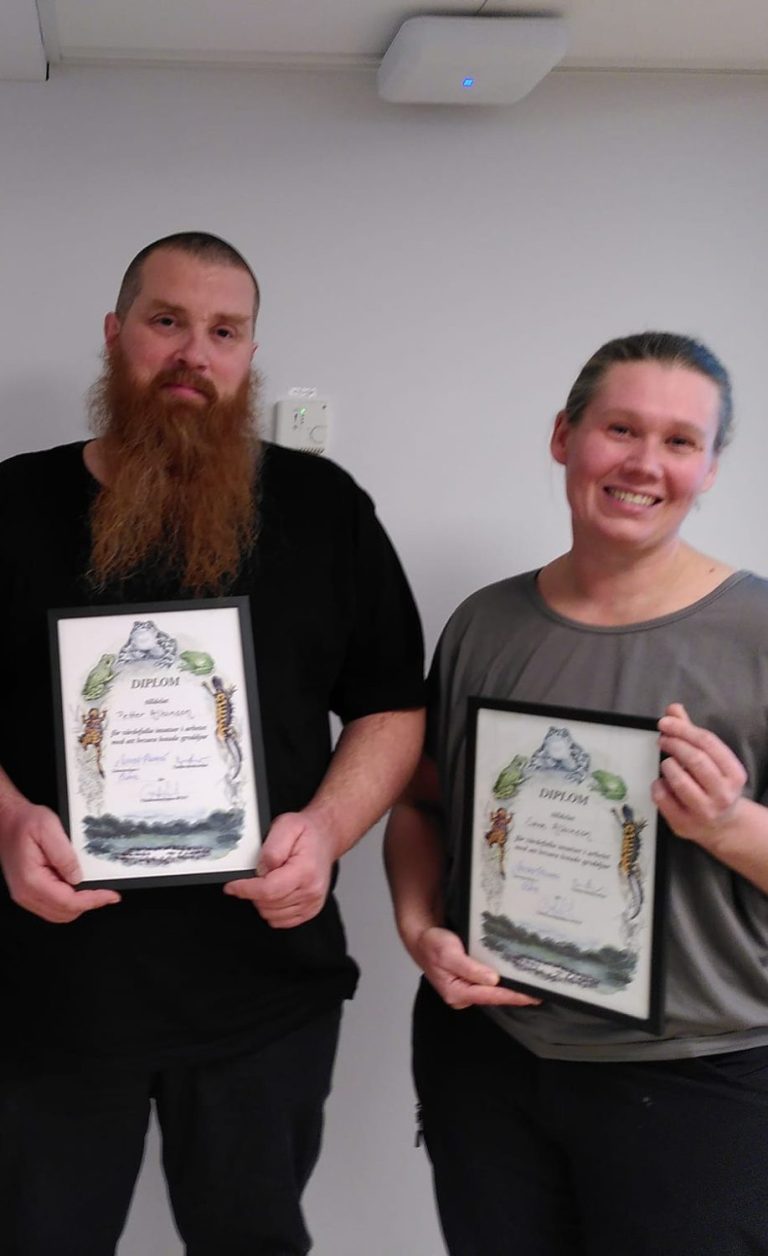 Sara har jobbat med naturvård på Grodgården i 20 år och de senaste åren utbildat sig med inriktning inom våtmark, bevara och restaurera natur, flora och fauna och biologisk mångfald i skog och trädgård. Vi har båda inventerat grod- och kräldjur i många år, åt bland annat Länsstyrelsen och Trafikverket.